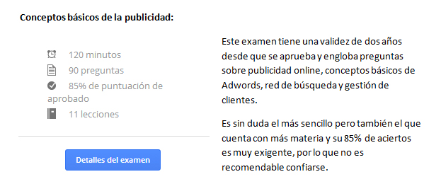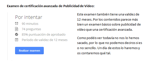 Google Ads Certificado de Adwords: requisitos y consejos para obtenerlo 28 agosto 2014 28-08-2014 Semmántica Google está potenciando que los que desarrollamos nuestra actividad utilizando Adwords podamos ofrecer a nuestros clientes una garantía de profesionalidad. Para ello creó los certificados de Adwords, unos títulos que permiten a los clientes corroborar que su proveedor de servicios SEM es de fiar. Estos certificados son personales y Google se los expide a quienes han demostrado su aptitud en Adwords a través de sus conocimientos… (Lo que básicamente quiere decir que hay que aprobar exámenes 😉 ) Para obtener el certificado básico y clásico de Adwords, que todo buen SEM Manager debería tener, hay aprobar dos de los tres exámenes posibles. Recientemente se ha añadido un nuevo certificado avanzado para vídeo, de modo que aquellos que ya tengan el básico pueden hacer una prueba específica para sacarse también este título y aportar valor a su empresa. Adquirir el certificado no es especialmente difícil para una persona que trabaja en el sector, pero sí puede ser un reto para iniciados y personas con poca experiencia. El mejor modo para sacarse los exámenes es practicando en el día a día, aunque también existen guías de estudio o cursos para aquellos que se decanten por el método tradicional de aprendizaje. Cada examen tiene un tiempo límite bastante justo y una batería de casi 100 preguntas con cuatro respuestas cada una. El número de aciertos para aprobar varía en función de la dificultad del examen: el básico y el de vídeo exigen un 85% de aciertos, el de búsqueda un 80% y el de display un 70%. La materia que entra en cada examen la podéis encontrar aquí. Las preguntas de los exámenes van desde las más obvias, como definir CPC, hasta cálculos de rentabilidad para cuentas en las que cada campaña cuenta con un ROI diferente. Sin duda lo peor es que hay muchas que su traducción no es clara y, cuando necesitas sacar un alto porcentaje de aciertos, no te puedes permitir el no entender la pregunta o que por una mala formulación varias de las respuestas parezcan correctas. Os hemos añadido unas imágenes en las que podríes ver cada curso así como una explicación de sus características. Os recomendamos a todos que os saquéis los certificados, tanto a los profesionales más curtidos como a los que estáis empezando. Cuando nosotros le demos la importancia que tiene a sacarse los certificados entonces los clientes empezarán a exigirlo; lo que a la larga permitirá atajar el intrusismo y la mala praxis en el sector. Próximamente vamos a impartir un curso en Madrid cuya edición en Barcelona ya tuvo mucho éxito. Está dirigido a personas que quieran obtener el certificado de Adwords pero si vuestra intención es aumentar y consolidar vuestros conocimientos en Adwords también os interesará. En la anterior edición un 75% de los alumnos obtuvieron la certificación. Si queréis apuntaros o buscáis más información esta es la página web. Esperamos que el artículo os haya sido de utilidad. Compártelo Los comentarios están cerrados.
