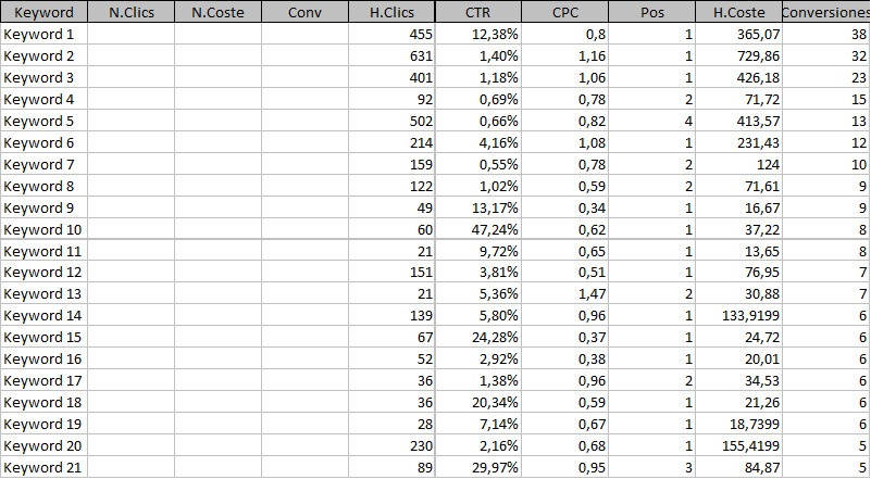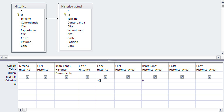 Google Ads Comparando históricos de keywords en Adwords 24 agosto 2012 24-08-2012 Semmántica Hoy vamos a inaugurar un nuevo área en nuestro blog. La llamaré «jugando con datos» y pretende ser de utilidad a cualquier que trabaje en temas de SEO o SEM o Analítica web. Hay varias formas de hacerlo, pero a mi me gusta usar Access para muchas de estas cosas. Sí, sí, Access, que por mucho que la gente se empeñe en utilizar Excel para todo, lo cierto es que con cuentas de cierto tamaño o para cierto procesos, una base de datos es el método más efectivo y Access quizás sea lo más sencillito (eso y que excel no soporta más de 1.000.000 de datos) Empecemos con el primer caso: Cuando se trabaja en Adwords con clientes nuevos que llevan cierto tiempo publicitándose en Adwords es habitual que la mejor decisión sea cerrar la cuenta antigua y aplicar una reestructuración completa en una nueva cuenta. Con ello evitamos que el histórico nos afectamente negativamente. También es habitual que en este tipo de casos se pase de una estructura de cuenta con palabras clave en concordancia abierta y se reestructure en una estructura más consistente, más segmentada, que incluya negativas… Hasta aquí todo normal, pero en cuentas de cierto tamaño, ¿como podemos estar seguros de no haber dejado tráfico relevante por el camino?. ¿Cómo lo haríais en este caso? Os cuento como lo hicimos en una cuenta que tenía en torno a 200.000 términos en su histórico: 1) Vamos a la cuenta vieja, seleccionamos el periodo que consideremos (habitualmente suelo tomar 6 meses o un año), vamos a Dimensiones > Ver términos de búsqueda > Descargar en csv 2) Vamos a la cuenta nueva, necesitaremos al menos uno o dos meses en rodaje, vamos a Dimensiones > Ver términos de búsqueda > Descargar en csv 3) Abrimos Access e importamos ambos ficheros. Lo hacemos desde Datos Externos > Importar csv. El primero lo llamamos Historico y el segundo Historico_Actual. 4) Vamos a crear > Diseño de consulta 5) Seleccionamos ambas tablas 6) Unimos las tablas por el campo «Términos de busqueda», pero le indicamos que nos muestre todos los resultados del Historico2. 7) Seleccionamos los campos que queremos comparar en ambas tablas, por ejemplo: clics, coste y conversiones. Aquí también podemos hacer cálculos, tasas o lo que consideremos adecuado. 8) Vamos a decirle, por ejemplo, que nos muestre los términos de búsqueda que en el pasado convirtieron y que en el tiempo que lleva la cuenta nueva no han tenido clics. Para ello, en condiciones incluimos Historico.Conv >0 y Historico_Actual.Impresiones = 0 9) Le decimos que ordene por volumen de impresiones de la cuenta antigua (o por conversiones). La consulta quedaría de la siguiente forma: Consulta de comparación de históricos en Google Adwords. Eh, ¡voilá! Tenemos ahí los términos de búsqueda que actualmente no se muestran en nuestra nueva cuenta ordenados por la importancia que hemos definido. Lo más importante es la importancia de emplear poco tiempo en el procesado de datos (tardaremos menos de 5 minutos), garantizándonos por supuesto una fiabilidad de los datos del 100%. y dedicarnos al análisis y la evaluación de los resultados que es donde está realmente lo importante. El resultado final sería el siguiente: Aquí vemos las keywords cuyo tráfico hemos perdido y podemos valorar su relevancia en cuanto a inversión y retorno. No os asusteis, en este caso la cuenta de leads y la mayoría se había incluido como negativas 🙂 Compártelo Los comentarios están cerrados.