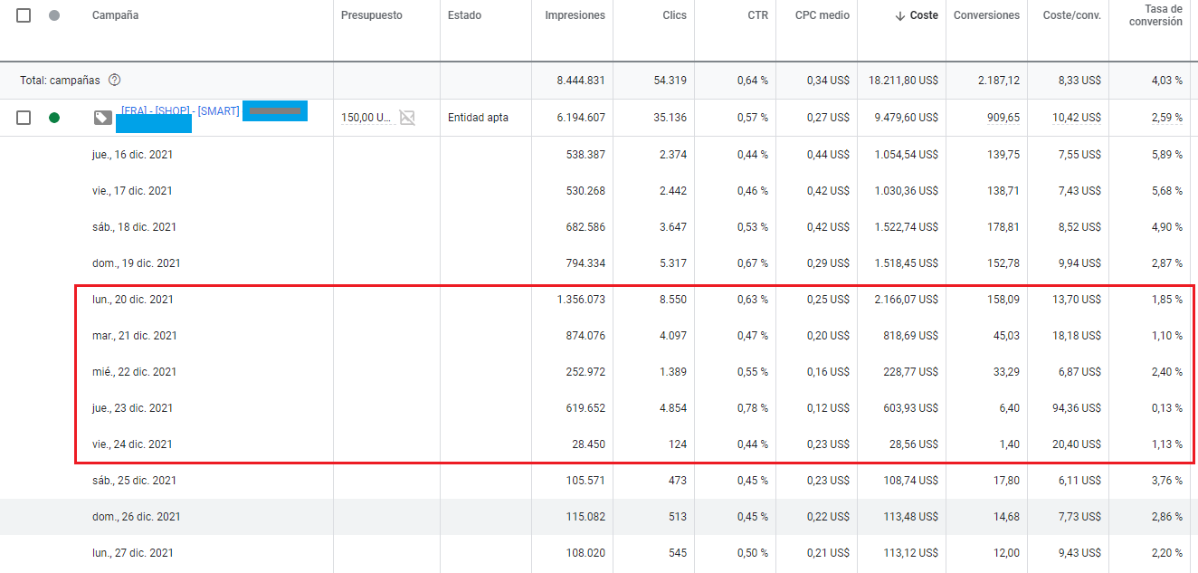 Google Ads Smart Shopping vs Shopping Tradicional ¿Qué campaña elegir? 26 enero 2022 26-01-2022 Semmántica Hace ya tiempo que Google Ads introdujo las campañas Smart Shopping como una versión mejorada de las tradicionales campañas de Google Shopping. Hoy analizamos, con datos en mano, la realidad sobre las Smart Shopping frente a sus antecesoras, las campañas de Shopping Tradicional ¡Sigue leyendo! ¿Qué ventajas nos prometen las Smart Shopping? Principalmente las campañas Smart Shopping se recomiendan para maximizar el volumen de conversiones o ventas, o bien conseguir más conversiones a una rentabilidad objetivo, gracias a los beneficios de las pujas automáticas Smart Bidding: una gestión optimizada de pujas en base a las señales del usuario, que solo el algoritmo puede aprovechar en tiempo real. En definitiva, una gestión más sencilla a la vez que más eficiente. Smart Shopping vs Shopping Tradicional Podemos decir que en general Smart Shopping cumple con lo prometido. Las Smart Shopping son campañas más fáciles de configurar, pero tiene limitaciones bastante importantes que deberías considerar antes de aplicarlas en tu cuenta: Un objetivo de visibilidad o tráfico es incompatible con este tipo de campaña. Smart Shopping sólo nos permite escoger entre ROAS Objetivo o maximizar conversiones. Los ajustes por dispositivo, zona geográfica o cualquier otro factor se realizan automáticamente. Controlar las impresiones y tráfico de un producto o grupo de productos resulta casi imposible. Aunque podemos incluir o excluir productos, Google Shopping no permite ajustar la puja por productos. Tu producto podría dejar de mostrarse, si la rentabilidad no es buena en ese momento o la conversión finaliza por otra vía. La capacidad de reacción del algoritmo es lenta ante determinadas situaciones críticas, por ejemplo: un cambio de precio en un producto que afecta directamente a la conversión o un cambio en la demanda del mercado (fin de temporada de Navidad, de un día a otro pasamos de % de conversión muy altas a muy bajas). En estos casos Smart Shopping puede tardar bastantes horas en readaptar las pujas y es recomendable incluso pausar la campaña temporalmente. A continuación os dejamos una imagen que ejemplifica a la perfección cómo el algoritmo tiene una capacidad de adaptación lenta ante este tipo de situaciones. En este caso: El día 20 subimos ROAS objetivo en previsión de un descenso en la tasa de conversión. El algoritmo ajusta las pujas a la baja y paralelamente hay menos competencia ese día. En consecuencia captamos más tráfico e invertimos más que el día anterior, a la vez que los CPAS se disparan. A partir de entonces le cuesta varios días volver a los rangos de CPA normales. Ejemplo de cómo el algoritmo tiene una capacidad de adaptación lenta ante situaciones críticas del mercado (Fuente: Semmantica) No podemos ver ni excluir términos de búsqueda. Es habitual que entre tráfico de marca propia en las campañas de Google Shopping u otros términos que no nos interesan. Smart Shopping potencia la venta procedente de usuarios de remarketing y no podemos actuar sobre estas audiencias (ni excluir ni ajustar). Mientras que en las campañas de Shopping tradicionales sí. Este es el split de usuarios y ventas según el tipo de usuario para un e-commerce real: Venta usuario nuevo vs Usuario recurrente según el tipo de campaña de Google Shopping (Fuente: Semmantica) Analizando la variación entre ambas campañas en clientes reales, sabemos que Google Shopping nos trae aproximadamente un –33% de transacciones mientras que el descenso en clientes nuevos, es solo del -10%. Es decir, en términos absolutos ganamos ventas de usuarios nuevos y bajamos ventas de usuarios recurrentes. Con Smart Shopping es más costoso diferenciar los productos por puja o presupuesto. Necesitamos crear una estructura más extensa de campañas al permitir crear 1 único grupo por campaña, donde se aplica la configuración de ROAS y presupuesto. Ok, estupendo, pero ¿Qué tipo de campaña elijo? Pues como todo en la vida, depende. Ambas tipologías tienen sus «pros & cons» pero básicamente reduciría la decisión al objetivo que persigas con tu campaña. Si quieres priorizar ventas o ROAS y te da igual el tipo de usuario –> Smart Shopping Si quieres priorizar ventas o tráfico de usuarios nuevos –> Shopping Tradicional Si quieres controlar la visibilidad de ciertos productos para que se muestren siempre con independencia de su rendimiento –> Shopping Tradicional. Esto es interesante cuando la venta finaliza por teléfono, formulario o comportamiento ROPO. Por suerte, recuerda que no tienes por qué publicar todo tu catálogo en la misma modalidad y es muy posible que te interese dividirlo según los objetivos de cada producto 🙂 Bonus Track: Elige la estrategia de puja según tu objetivo A menudo marcamos la opción de puja que conocemos mejor o con la que nos sentimos más seguros, pero no reparamos a pensar en las implicaciones que esto tiene a nivel de optimización y visibilidad en nuestras campañas. Conoce cómo te afecta cada opción de puja en la optimización de tus campañas. Recuerda que Smart Shopping solo te permite 2 opciones de configuración. Estrategias de puja. Características. (Fuente: Semmantica) ¿Quieres saber más sobre Google Ads? Puedes leer mucho más sobre optimización, estrategias, campañas y todo lo relativo al SEM en nuestro blog. Compártelo Los comentarios están cerrados.